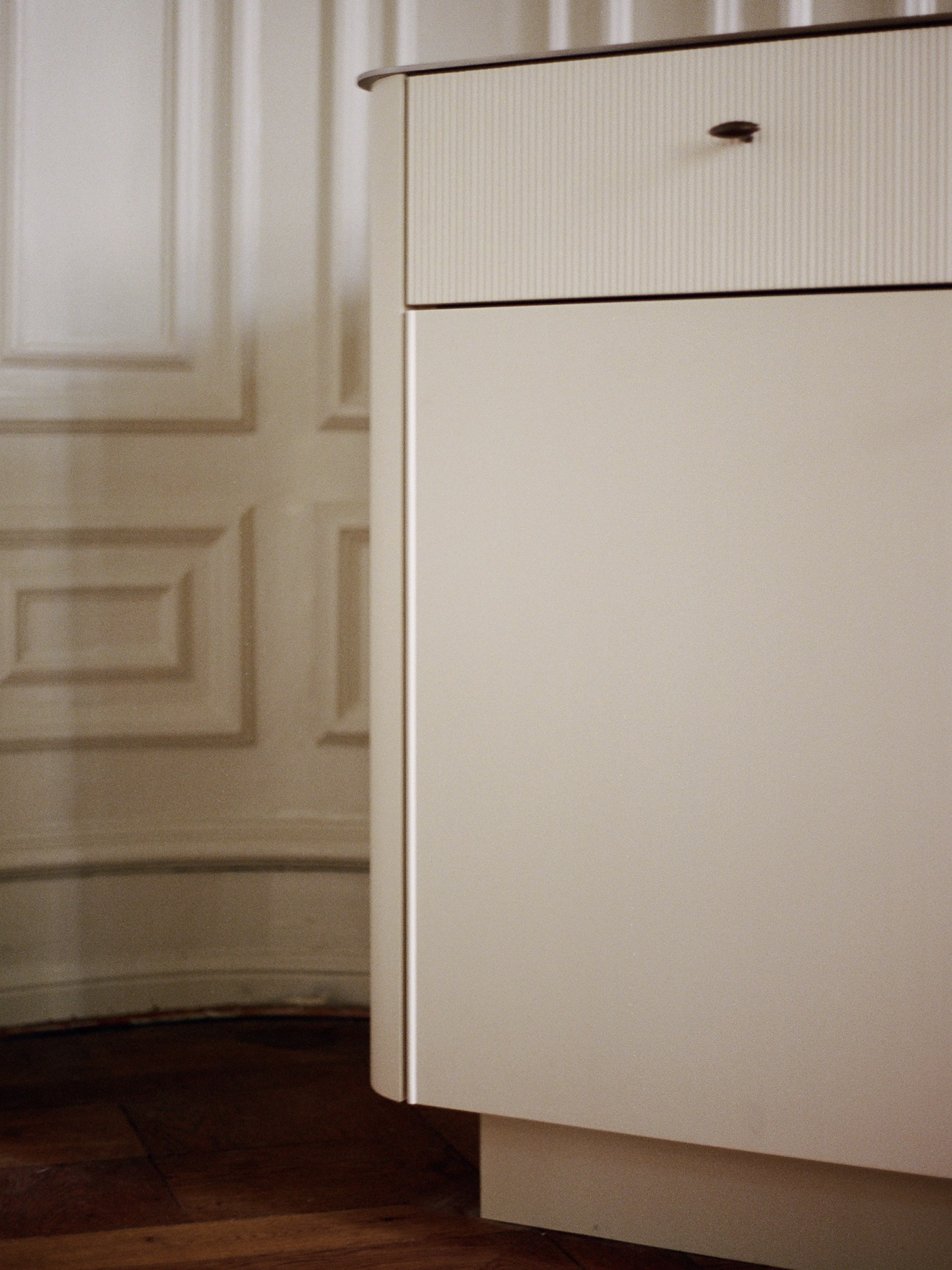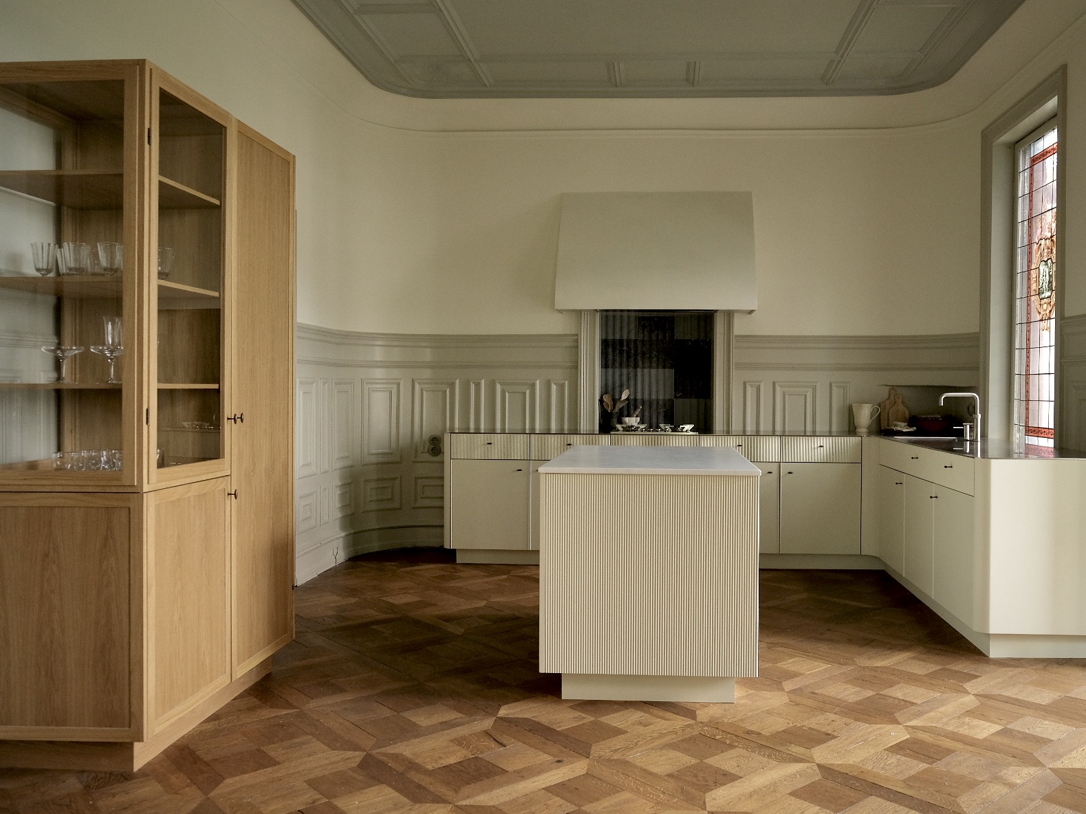 Bespoke organic shaped kitchen and tambour island with drawers and open shelving for storage and a combined glass cabinet merged with full fridge cabinet. Different and harmonic use of materials such as oak, steel, dark brass, marble and organic shapes and proportions make this kitchen such an intersting space to adventure details and full scale vision come together.